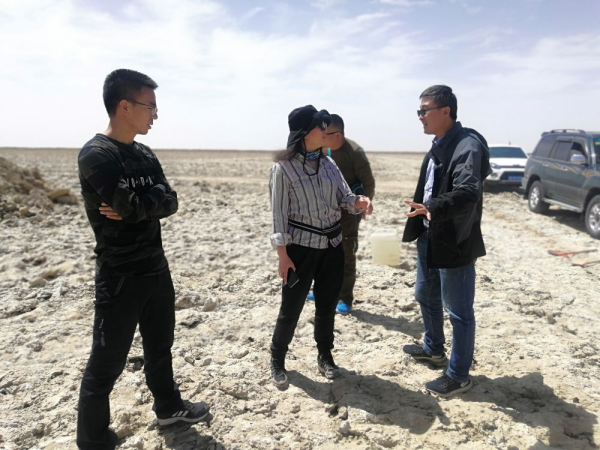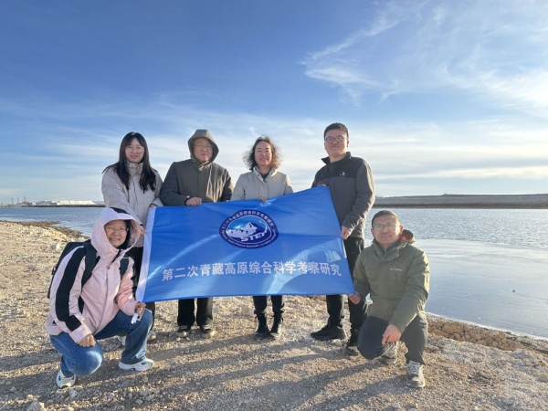 2024年11月25日,王建萍(右三)和科研團隊在鹽湖進行野外考察。