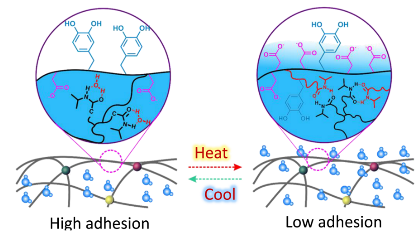 這項突破并非一蹴而就。周峰回憶,幾年前,團隊一直攻關(guān)高強韌黏附水凝膠材料,偶然發(fā)現(xiàn)一種材料在多次按壓后黏性驟降?!霸摤F(xiàn)象引發(fā)了我們的極大興趣,經(jīng)過對材料的成分分析、機理驗證等,才知道原來在多次按壓以后,手部溫度傳遞到凝膠表面,致使凝膠發(fā)生相變,呈現(xiàn)低黏附態(tài)?!边@讓團隊意識到,溫度可能是調(diào)控黏附性能的鑰匙。