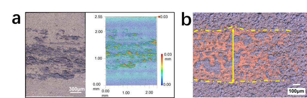 1000℃ 下摩擦 30 min(a)和 1000℃ 下摩擦 180 min(b)后材料磨損表面形態(tài) 圖片來源:蘭州化物所