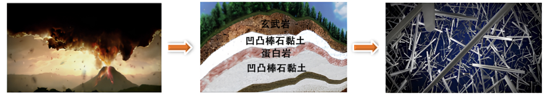凹凸棒石的“分子身份證號(hào)”為Si8Mg5O20(OH)2(H2O)4·4H2O。它誕生于白堊紀(jì)至第三紀(jì)漫長(zhǎng)的地質(zhì)演化過(guò)程中,是火山沉積、熱液蝕變與漫長(zhǎng)風(fēng)化共同孕育的結(jié)晶。歷經(jīng)億萬(wàn)年錘煉形成的獨(dú)特結(jié)構(gòu),至今仍是人類難以合成的自然杰作。