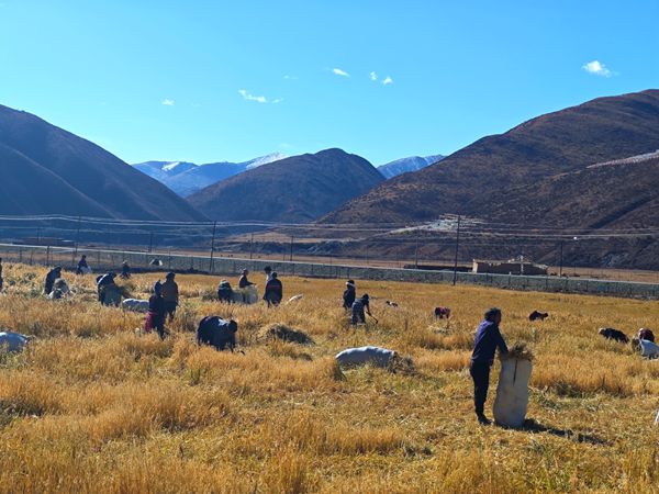 11月3日,為檢驗(yàn)優(yōu)質(zhì)燕麥品種和高產(chǎn)青稞品種在高海拔地區(qū)的產(chǎn)量,牧羊村“兩委”和駐村工作隊(duì)組織牧民開展青稞、燕麥?zhǔn)崭罟ぷ鳌S捎诓シN時(shí)間較晚,加之生育期降水較多,燕麥存在結(jié)實(shí)率低,籽粒不飽滿問題,青稞雖長勢(shì)良好,植株較高,但出現(xiàn)部分倒伏情況。