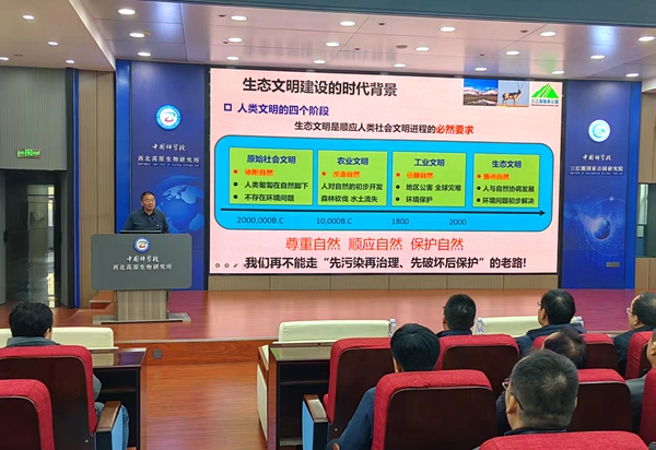 隨后,黨委委員、高原生態(tài)學(xué)研究中心主任徐世曉研究員向參加活動(dòng)的黨員作了“致力高原生態(tài)學(xué)研究 助力生態(tài)文明發(fā)展”專題報(bào)告,報(bào)告從生態(tài)文明建設(shè)的時(shí)代背景,國(guó)家戰(zhàn)略需求、青藏高原生態(tài)安全屏障重要作用等三方面,詳細(xì)介紹了西北高原所針對(duì)高寒區(qū)生態(tài)系統(tǒng)脆弱性、敏感性,生態(tài)保護(hù)和可持續(xù)發(fā)展開展的一系列研究和取得的成果。通過(guò)大量案例和數(shù)據(jù),讓大家深入了解了生態(tài)修復(fù)、綠色產(chǎn)業(yè)發(fā)展的成功經(jīng)驗(yàn),深刻認(rèn)識(shí)到科學(xué)保護(hù)青藏高原生態(tài)系統(tǒng)、推動(dòng)綠色發(fā)展的重要性。