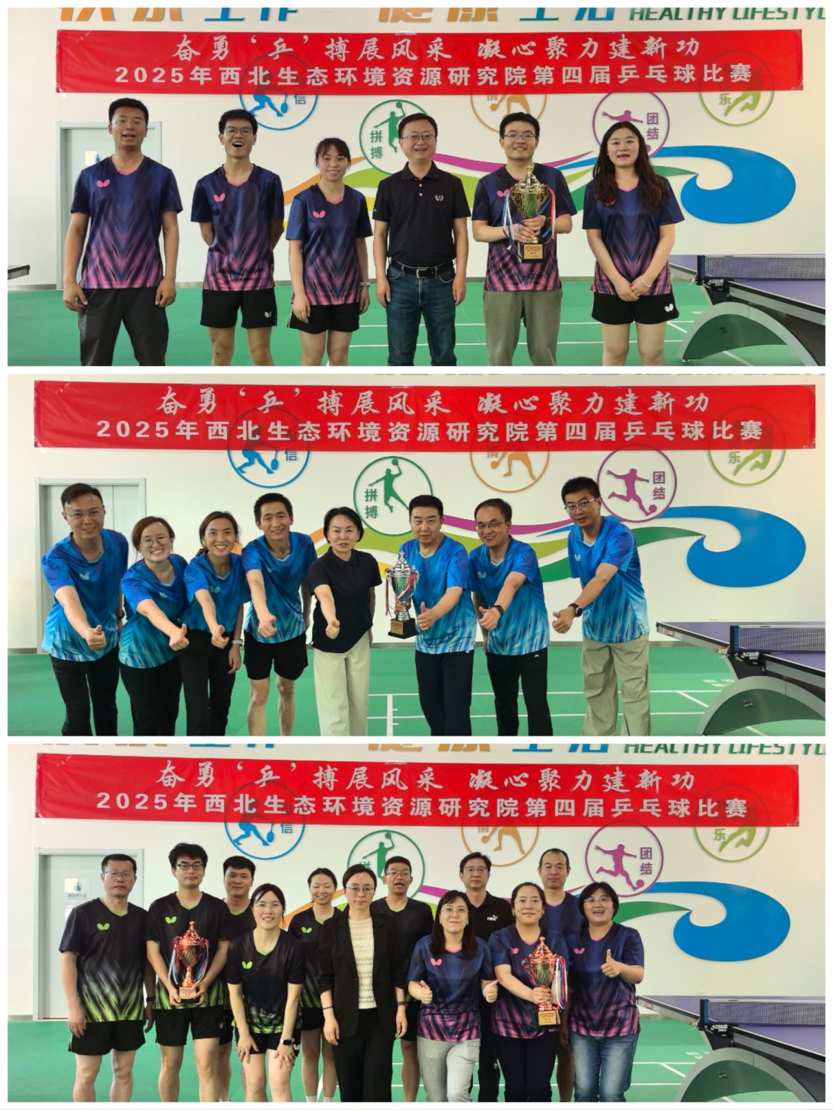 經(jīng)過緊張激烈的角逐,最終沙漠與沙漠化研究室代表隊獲得冠軍,文獻情報中心代表隊獲得亞軍,凍土與寒區(qū)工程研究室代表隊和管理部門代表隊獲得季軍。張明峰、朱強、王少影獲男子單打冠亞季軍,鄧雅文、董麗蘋、尤哲敏獲女子單打冠亞季軍。