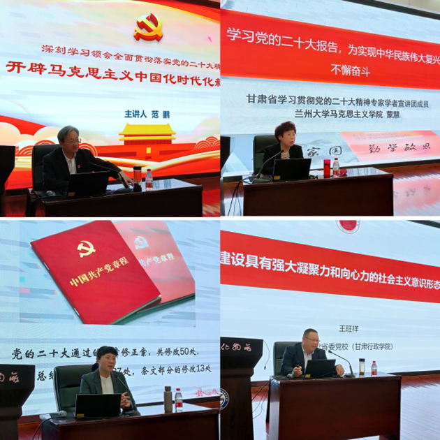 中共甘肅省委黨校文史教研部主任王旺祥教授,甘肅省委專家學(xué)者宣講團(tuán)成員、中共甘肅省委黨校黨的建設(shè)與領(lǐng)導(dǎo)科學(xué)教研部主任高璐佳,甘肅省學(xué)習(xí)貫徹黨的二十大精神專家學(xué)者宣講團(tuán)成員、蘭州大學(xué)馬克思主義學(xué)院蒙慧教授,甘肅省委專家學(xué)者宣講團(tuán)成員、蘭州大學(xué)范鵬教授分別應(yīng)邀作了題為“建設(shè)具有強(qiáng)大凝聚力和向心力的社會(huì)主義意識(shí)形態(tài)”“黨的二十大黨章修改的重點(diǎn)內(nèi)容及其重大深遠(yuǎn)歷史意義”“學(xué)習(xí)黨的二十大報(bào)告,為實(shí)現(xiàn)中華民族偉大復(fù)興不懈奮斗”“深刻學(xué)習(xí)領(lǐng)會(huì)全面貫徹落實(shí)黨的二十大精神 開辟馬克思主義中國化時(shí)代化新境界”的報(bào)告。