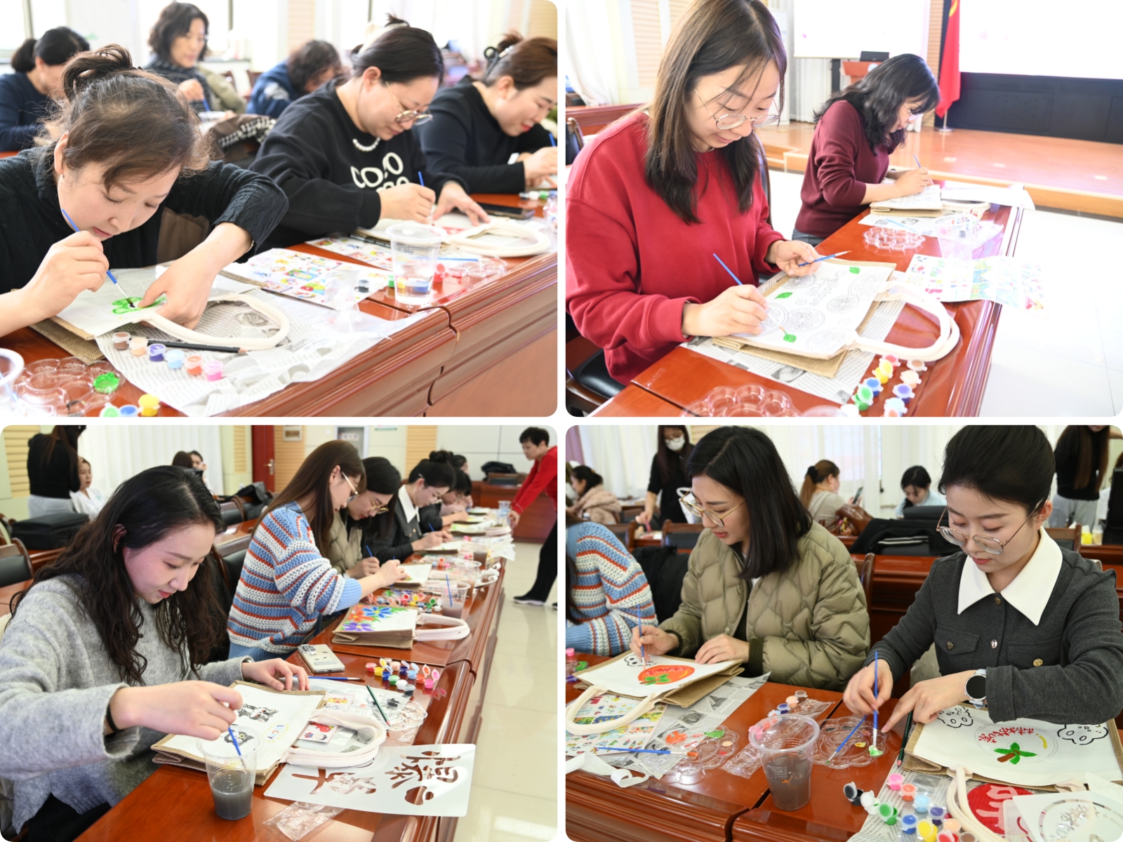 活動場面溫馨快樂,輕松喜悅。這一邊,繪畫老師將基本操作和繪畫技巧講完后,大家迫不及待開始了創(chuàng)作,或填色、或臨摹、或創(chuàng)作,五顏六色的心情變成了帆布包上生動的花草和卡通人物,互相交流、彼此借鑒。那一邊,化妝老師為大家整理好妝容,隨著“咔噠”地快門聲,定格下工作中最美的一面……