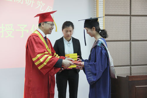 畢業(yè)典禮在與會(huì)人員集體奏唱國(guó)歌聲中拉開序幕。主持工作的副所長(zhǎng)吳志堅(jiān)代表所領(lǐng)導(dǎo)發(fā)表講話,對(duì)2017屆畢業(yè)生表示衷心地祝賀,對(duì)今后的發(fā)展提出了四個(gè)“好”:思想好、身體好、學(xué)習(xí)好、工作好。殷切期望畢業(yè)生能有一個(gè)積極、樂觀、不斷進(jìn)取的健康思想,能夠積極進(jìn)行體育鍛煉,保持健康身體,能夠在今后的道路上不斷學(xué)習(xí),成為今后工作崗位上的棟梁之才,能夠積極應(yīng)對(duì)工作中遇到的各種情況,對(duì)工作富有熱情。吳志堅(jiān)還宣讀了中國(guó)科學(xué)院大學(xué)丁仲禮校長(zhǎng)給2017屆畢業(yè)生的一封信,希望畢業(yè)生擔(dān)負(fù)起丁仲禮校長(zhǎng)所給予的厚望。