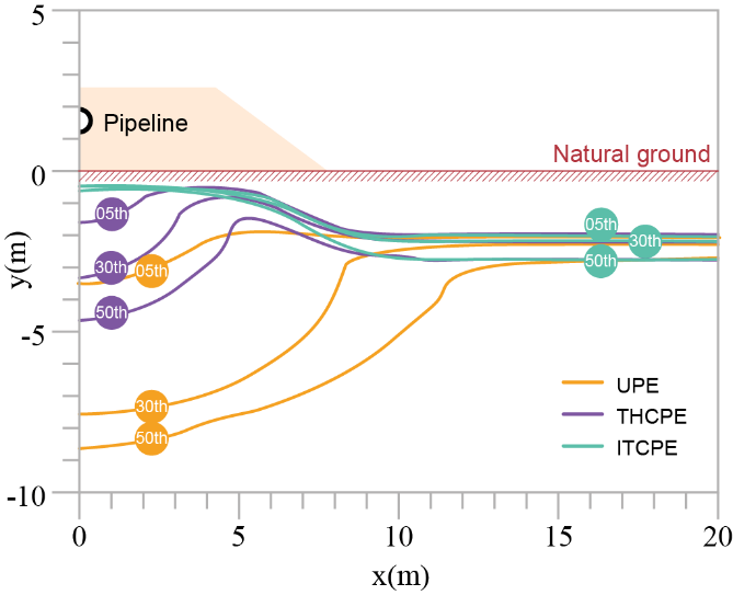 基于上述科學問題,中國科學院西北生態(tài)環(huán)境資源研究院科研團隊研究提出一種新型倒T型碎石管道路堤(ITCPE)結(jié)構(gòu),該結(jié)構(gòu)基于“煙囪效應(yīng)”原理,利用管道自身熱量強化對流,可更有效地帶走管道熱量,冷卻凍土。此外,基于現(xiàn)場監(jiān)測系統(tǒng)的實測邊界,結(jié)合多孔介質(zhì)及相變理論,對ITCPE、無保護管道路堤(UPE)和傳統(tǒng)水平碎石管道路堤(THCPE)結(jié)構(gòu)在長期運行過程中的熱效應(yīng)進行了長期數(shù)值預測。研究結(jié)果表明,無論是有保溫層的埋地管道結(jié)構(gòu)、無防護的管堤結(jié)構(gòu),還是傳統(tǒng)的水平碎石管堤結(jié)構(gòu),都無法很好地解決中俄原油管線融沉問題。但新型ITCPE結(jié)構(gòu)可以有效減緩管道融沉問題,而且在管道運營50年內(nèi)可顯著維持管堤下伏凍土的人為凍土上限高度。相關(guān)研究結(jié)果為中俄原油管線提供了技術(shù)支持,同時也為全球多年凍土區(qū)其他管道工程的設(shè)計和維護提供科學參考。