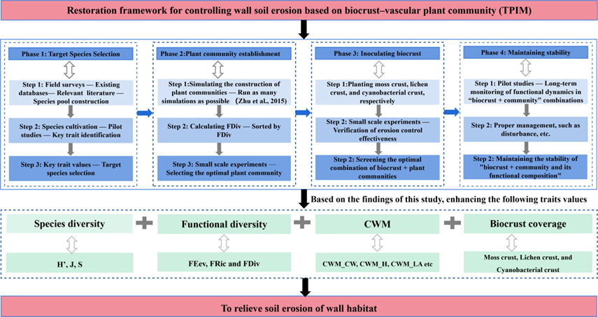 研究發(fā)現(xiàn),維管束植物物種豐富度、物種多樣性、功能豐富度、群落加權(quán)平均和苔蘚結(jié)皮蓋度由土長城遺址頂部向下部顯著降低,且與土長城兩側(cè)土體侵蝕程度呈負相關(guān)(圖1),表明土長城本體較高的區(qū)域有利于維管束植物和生物結(jié)皮的定殖和生長。同時,維管束植物和生物結(jié)皮的協(xié)同作用能有效緩解遺址本體遭受風雨侵蝕(圖2)?;诖?,研究人員提出了基于生物結(jié)皮和維管束植物群落構(gòu)建目標物種選擇、植物群落構(gòu)建、生物結(jié)皮接種和維持群落穩(wěn)定等增強土長城抗侵蝕的“修復(fù)框架”(圖3),為土長城遺址本體侵蝕防治提供了新思路。