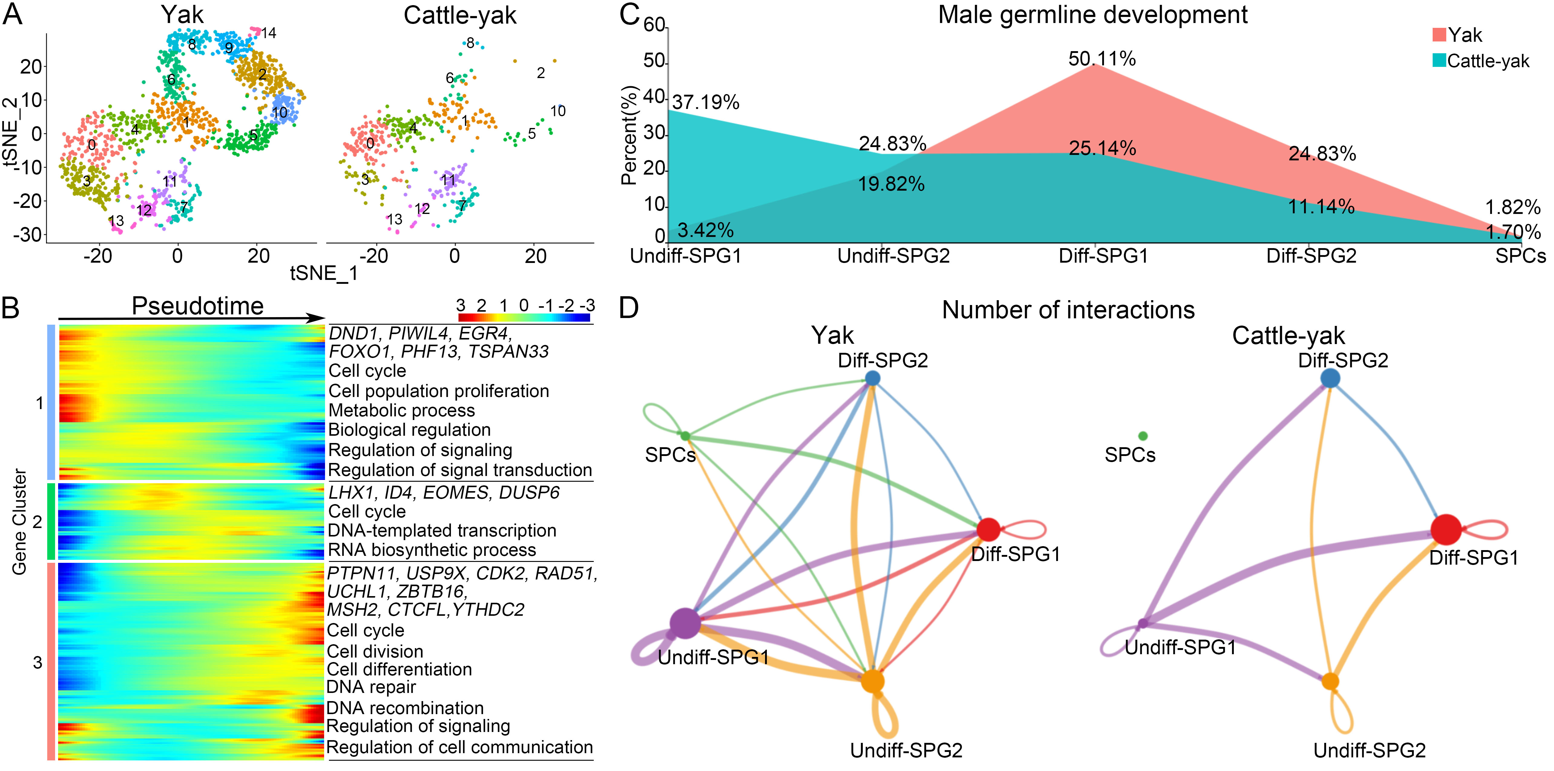單細(xì)胞轉(zhuǎn)錄組分析揭示犏牛精原細(xì)胞命運(yùn)決定異常。A:牦牛和犏牛生殖細(xì)胞單細(xì)胞tSNE聚類(lèi)圖;B:隨擬時(shí)序變化的不同類(lèi)型生殖細(xì)胞基因表達(dá)特征分析;C:兩種牛精原細(xì)胞和早期精母細(xì)胞比例;D:細(xì)胞通訊分析顯示兩種牛不同類(lèi)型精原細(xì)胞互作存在顯著差異。未分化型精原細(xì)胞1(Undiff-SPG1)、未分化型精原細(xì)胞2(Undiff-SPG2)、分化型精原細(xì)胞1(Diff-SPG1)、分化型精原細(xì)胞2(Diff-SPG2)和精母細(xì)胞(SPCs)