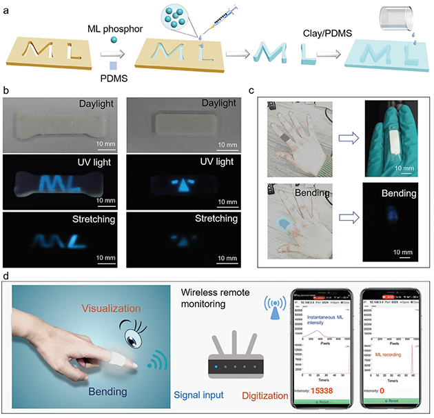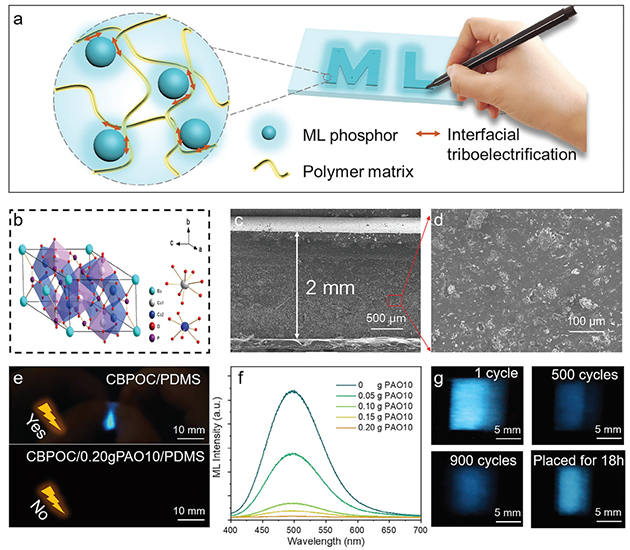 最近,該團(tuán)隊發(fā)展出了一種基于界面摩擦電場誘導(dǎo)電子轟擊發(fā)光模型的稀土摻雜磷酸鹽基摩擦/力致發(fā)光復(fù)合材料(Ca6BaP4O17:Ce3+/PDMS,圖1)。無需預(yù)充能,該材料在機械力學(xué)的刺激下可直接展現(xiàn)出明亮的藍(lán)色摩擦/力致發(fā)光。