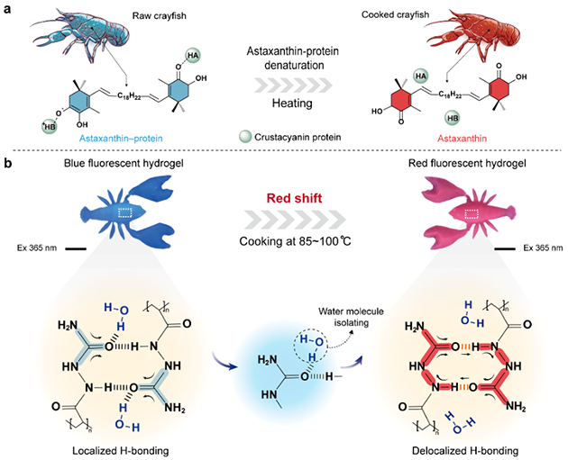 圖1. 蝦青素-蛋白質(zhì)加熱變性過程和受此啟發(fā)的熒光水凝膠制備機(jī)理