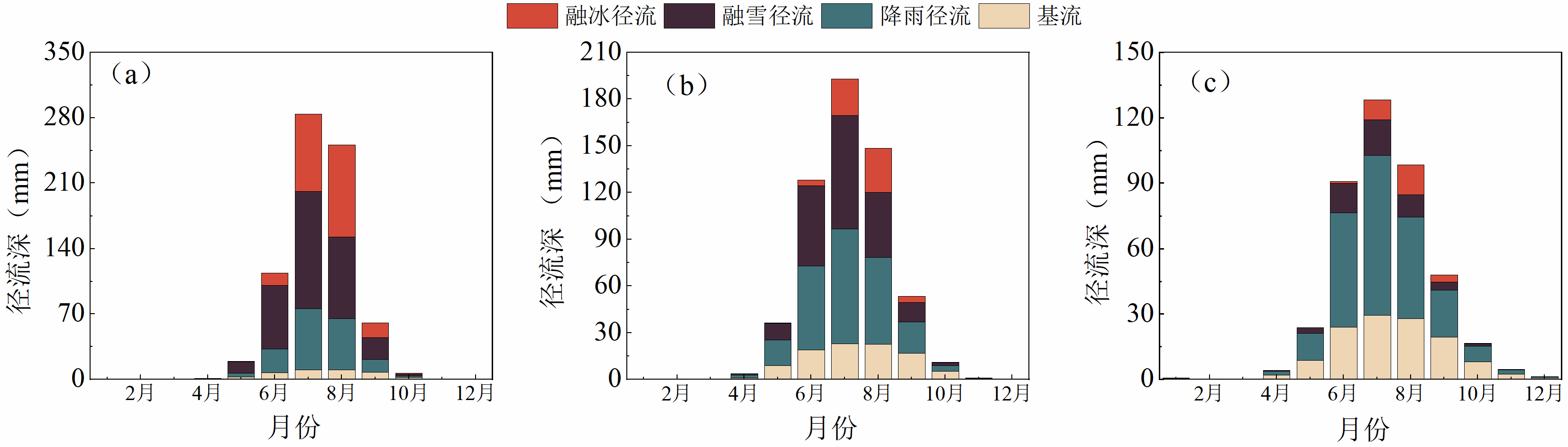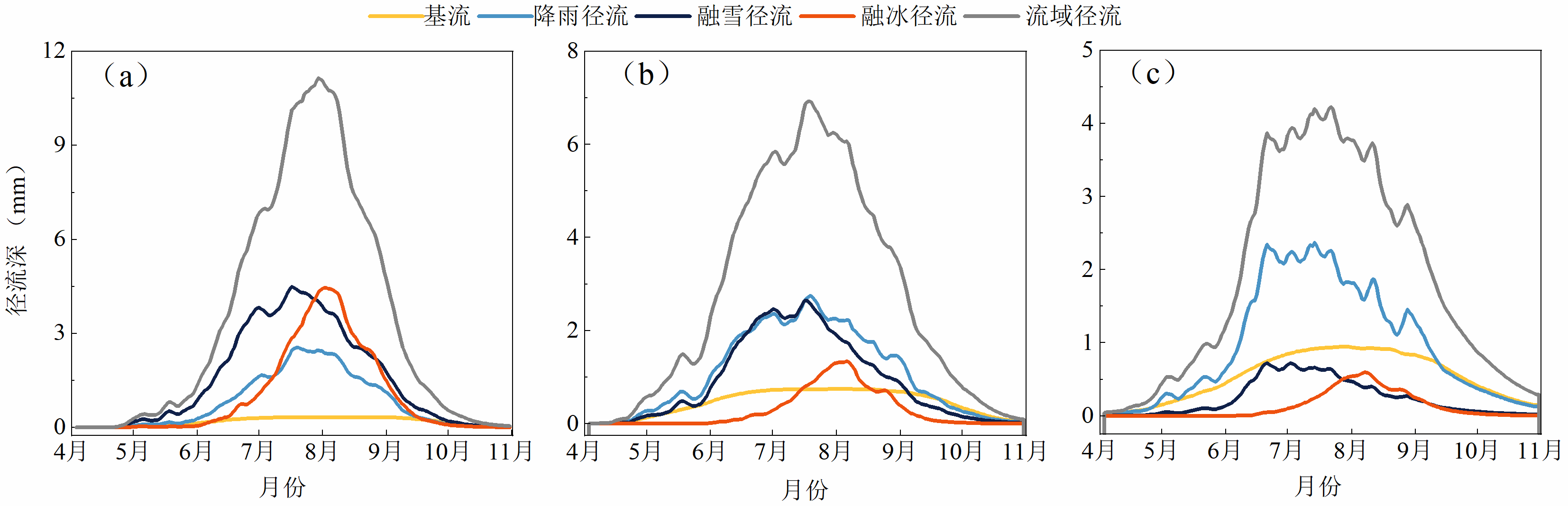 圖1 烏源1號冰川(a)、總控(b)和后峽(c)子流域4?10月基流,降雨徑流,融雪徑流和融冰徑流
