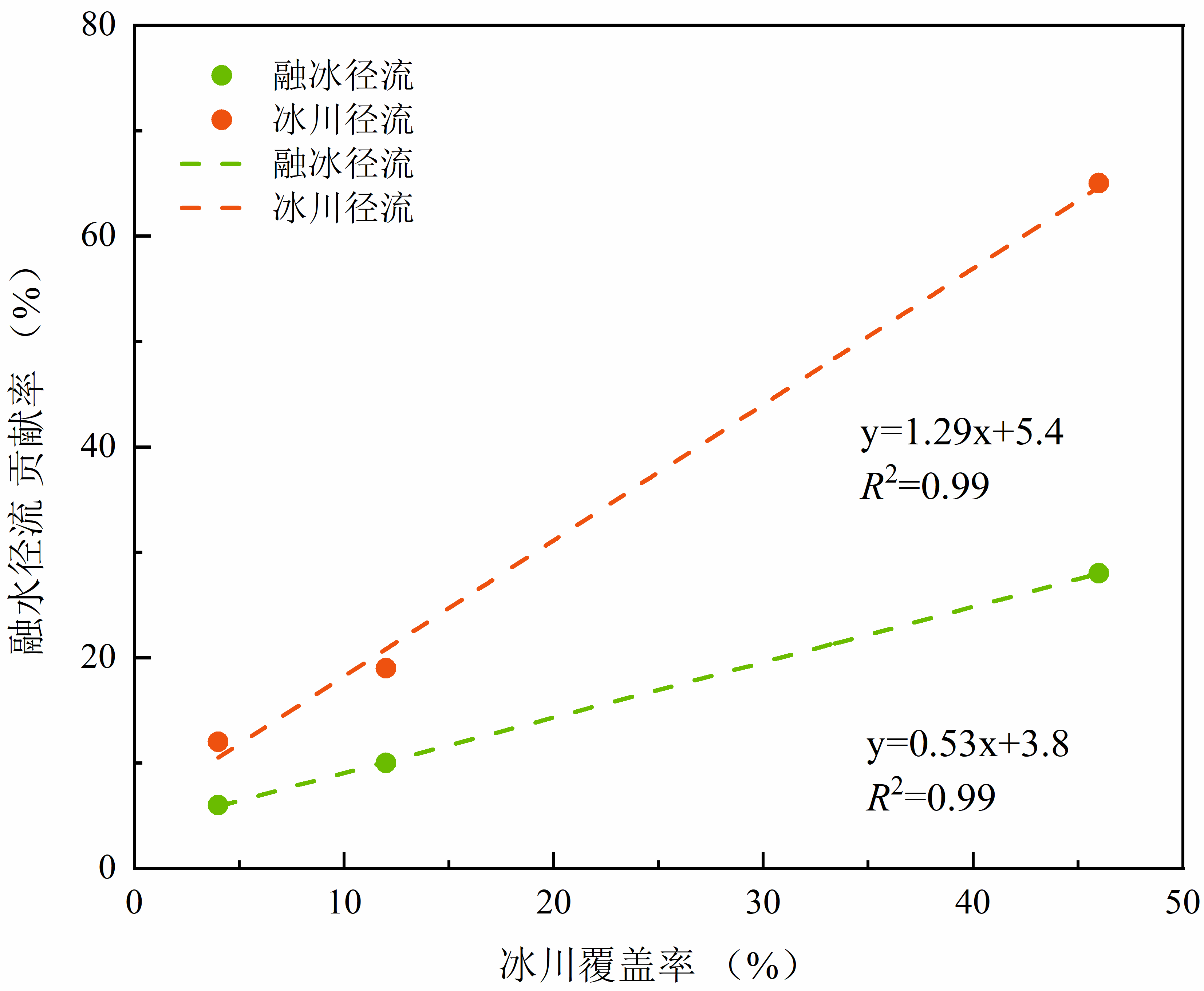 圖3 烏河流域融冰徑流和冰川徑流(包括融冰徑流、冰川表面的融雪徑流與降雨徑流)與冰川覆蓋率的關(guān)系