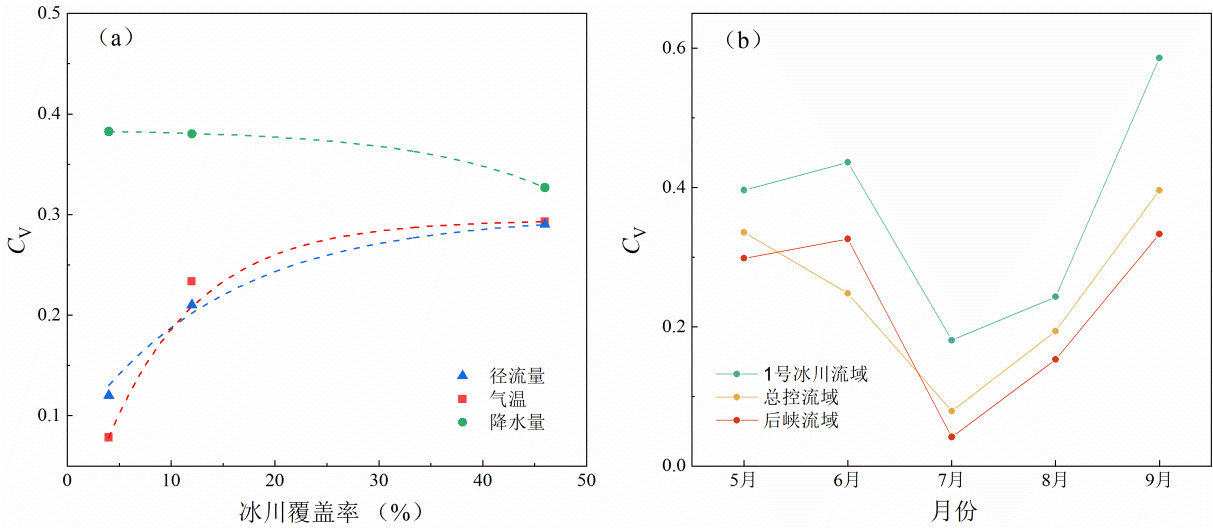 (3)三個(gè)子流域融冰徑流和冰川徑流的貢獻(xiàn)率與冰川覆蓋率呈線性關(guān)系,與前人在阿爾卑斯山38個(gè)冰川覆蓋流域研究得到的對數(shù)關(guān)系有所不同,主要是烏河流域冰川在夏季強(qiáng)烈消融所致(圖3)。三個(gè)子流域的徑流變差系數(shù)(CV)分別為0.29、0.21和0.12,隨著冰川覆蓋率的降低而減小,這主要與流域徑流組成、下墊面特征等因素有關(guān)(圖4)。