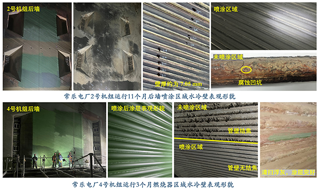 中國科學(xué)院蘭州化學(xué)物理研究所低碳能源材料組高祥虎研究員團隊近年來圍繞電站關(guān)鍵材料,專注于大型電站鍋爐輻射受熱面防護與節(jié)能增效關(guān)鍵技術(shù)研究。團隊研發(fā)的納米高熵防護與節(jié)能增效陶瓷涂層,突破了陶瓷材料防結(jié)焦、耐高溫腐蝕、紅外增效、高導(dǎo)熱率、熱膨脹系數(shù)可調(diào)等關(guān)鍵技術(shù),同時具有降低煤耗、提高煤種適應(yīng)性的多功能特點,可滿足大型調(diào)峰電站及其他常規(guī)電站的使用需求。在常樂電廠的大力支持下,該材料先后在其2號、4號機組開展應(yīng)用。在爐膛服役1年后,使用了涂層材料的水冷壁管壁表面光滑致密、無結(jié)焦、附著物易清除、未出現(xiàn)凹坑和管壁減薄等腐蝕情況,表現(xiàn)出優(yōu)異的耐高溫腐蝕和防結(jié)焦性能。經(jīng)西安熱工研究院有限公司現(xiàn)場檢測,管壁厚度較噴涂前無明顯變化。對照相同區(qū)域未噴涂防護涂層的水冷壁表面均出現(xiàn)明顯的腐蝕凹坑,并附著有褐色的腐蝕產(chǎn)物。