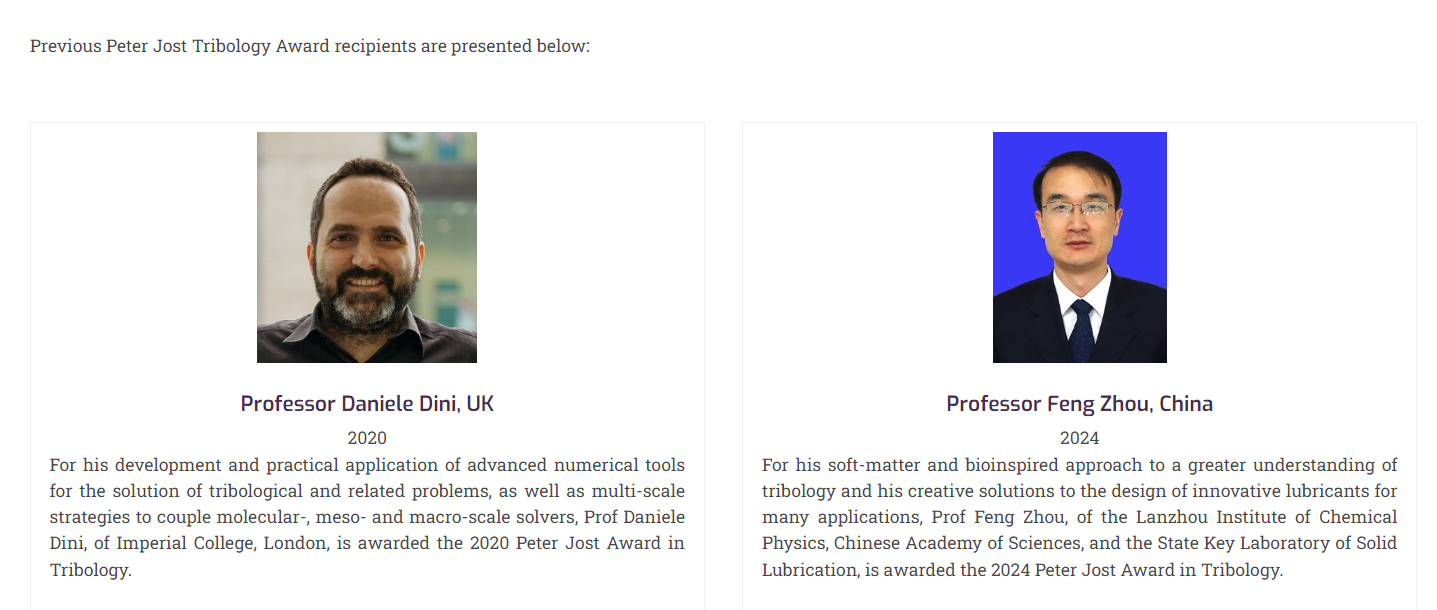 蘭州化物所周峰研究員獲2024年彼得·喬斯特摩擦學(xué)獎