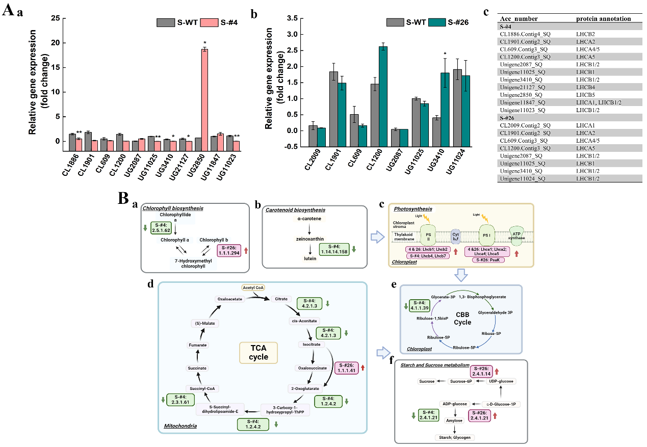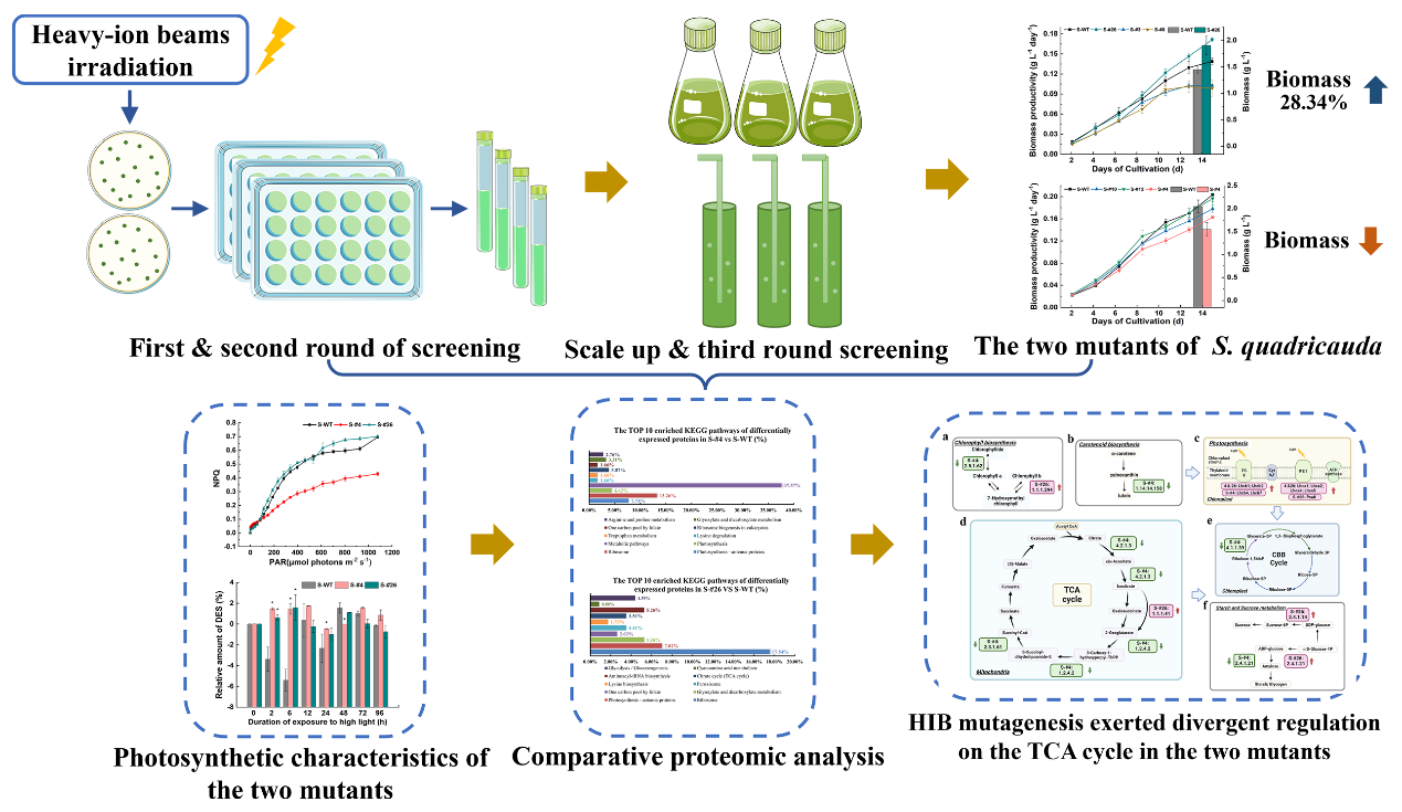 科研人員利用蘭州重離子研究裝置(HIRFL)提供的碳離子束,對環(huán)境適應(yīng)性強的四尾柵藻進行了誘變選育,獲得了兩株光合特性、固碳能力與野生型對比鮮明的突變株;其中高固碳能力突變株生物量積累高于野生型的28.34 %,并且表現(xiàn)出對長時間高光脅迫的適應(yīng)性。通過對兩株突變株光合特征與比較蛋白組學(xué)的關(guān)聯(lián)分析,科研人員發(fā)現(xiàn)重離子束輻射誘導(dǎo)的中心碳代謝差異蛋白對突變株固碳能力強弱起到重要調(diào)控作用;另外,與突變株固碳能力關(guān)聯(lián)的三羧酸循環(huán)差異調(diào)控,為高效固碳微藻工程株選育提供了潛在靶點。