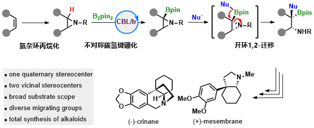 近日,該團隊針對簡單烯烴不對稱多官能團化存在的問題,利用其發(fā)展的CBL/銥催化體系,結合烯烴的氮雜環(huán)丙烷化/開環(huán)1,2-遷移硼化的組合策略,實現了簡單烯烴的不對稱三官能團化反應,高對映選擇性地實現了鄰位季碳中心的手性胺。同時,利用該方法,團隊首次實現了從廉價易得的環(huán)己烯到石蒜科生物堿(-)-crinane和(+)-mesembrane的對映選擇性全合成。