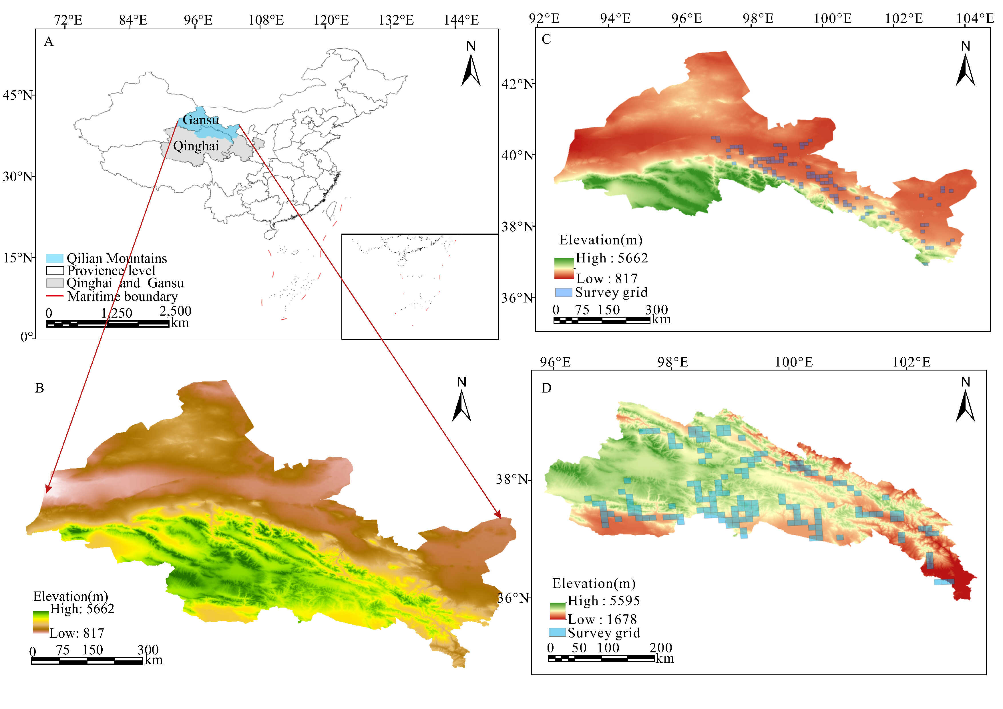 研究區(qū)域分布圖。(A)祁連山位置;(B) 祁連山海拔分布變化;(C) NSQM中鳥類調查網格海拔分布變化;(D) SSQM