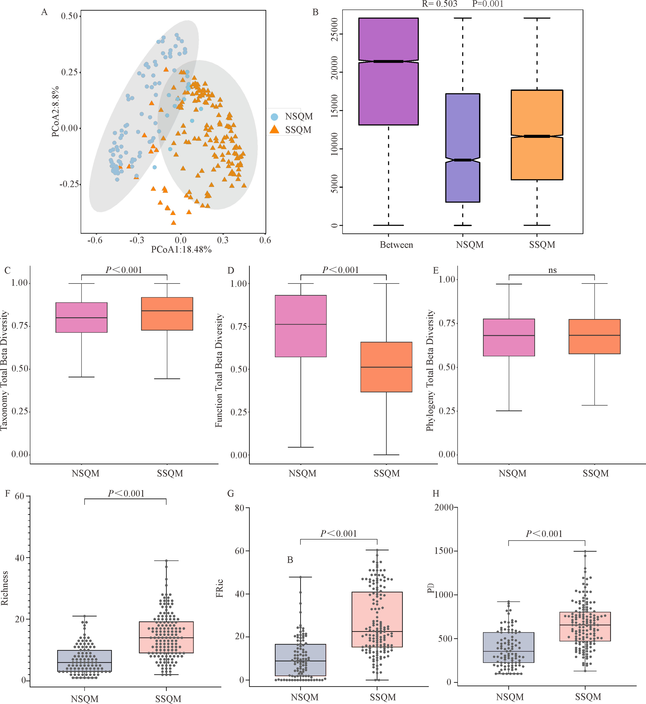 祁連山南北坡鳥類群落多樣性格局。(A) NSQM和SSQM中鳥類β多樣性的主坐標分析(PCoA);(B) NSQM和SSQM中鳥類群落的相似性(ANOSIM);(C, D, E) NSQM和SSQM中鳥類群落分類, 功能, 系統(tǒng)發(fā)育總β多樣性;(F, G, H) NSQM和SSQM中鳥類群落Richness指數, FRic和PD指數