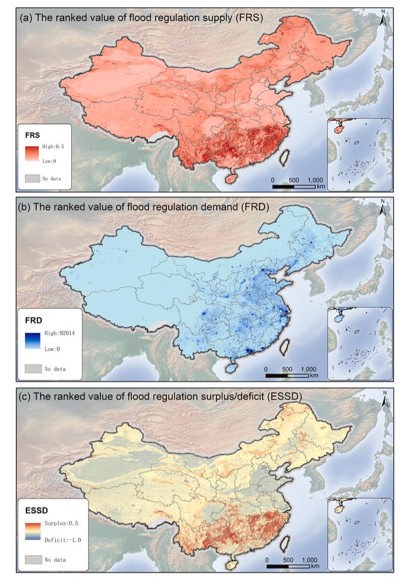 FRESF工具箱2號模塊的示例輸出,空間明確地繪制了我國2020年洪水調蓄生態(tài)系統(tǒng)服務的供給?。╝)、需求 (b) 和赤字?。╟)