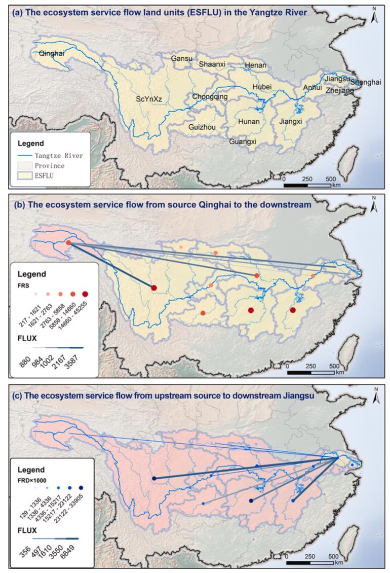 FRESF工具箱3號模塊的示例輸出,定量評估了長江流域2020年洪水調蓄生態(tài)系統(tǒng)服務流