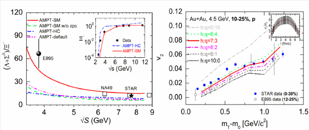 圖1.?多相輸運(yùn)計(jì)算的單-雙奇異重子比值(左)以及質(zhì)子橢圓流(右)與實(shí)驗(yàn)數(shù)據(jù)的比較
