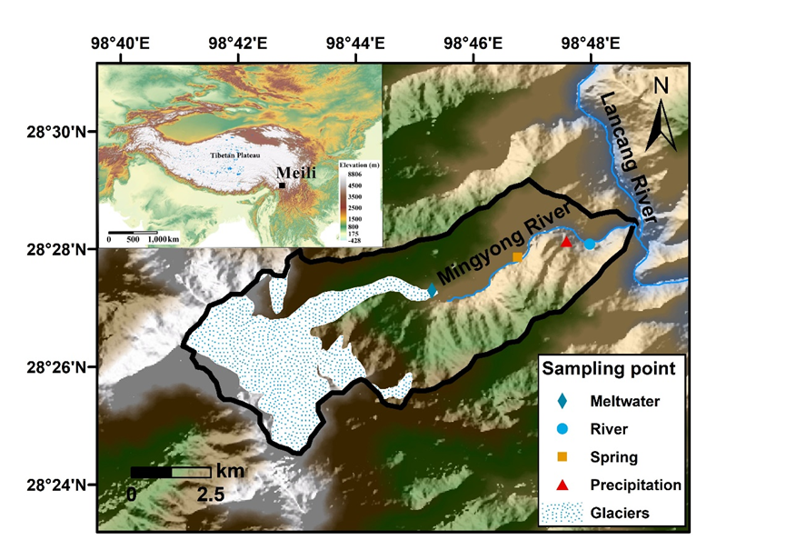 中國科學(xué)院西北生態(tài)環(huán)境資源研究院冰凍圈科學(xué)與凍土工程重點(diǎn)實(shí)驗(yàn)室科研團(tuán)隊(duì),聯(lián)合中國科學(xué)院地質(zhì)與地球物理研究所、浙江師范大學(xué)、云南大學(xué)等多家單位,依托云南麗江玉龍雪山冰凍圈與可持續(xù)發(fā)展國家野外科學(xué)觀測研究站“一站四區(qū)”觀測網(wǎng),在梅里雪山明永河流域開展了為期一年的日尺度觀測,剖析冰川徑流中總汞濃度的變化規(guī)律及控制因素,量化汞的輸入通量,并評估明永河流域以及整個(gè)青藏高原冰川徑流中總汞的輸出通量。