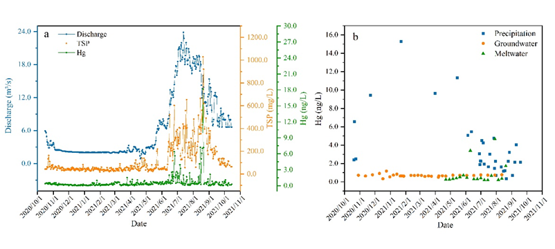 研究發(fā)現(xiàn),季風(fēng)期冰川徑流中總汞濃度高于非季風(fēng)期。季風(fēng)期冰川徑流中的總汞濃度與總懸浮顆粒物(TSP)、溶解有機(jī)碳(DOC)和溶解無機(jī)碳(DIC)呈現(xiàn)顯著正相關(guān)(p < 0.001),非季風(fēng)期徑流中的總汞與TSP、流量、溫度和降水量顯著正相關(guān)(p?。肌?.001),與DIC呈現(xiàn)負(fù)相關(guān)關(guān)系(p?。肌?.01),表明冰川徑流中總汞濃度受到氣象、水文過程和其它環(huán)境因子的共同影響。