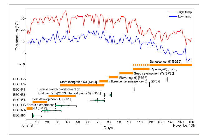 生長發(fā)育階段及其標(biāo)志性發(fā)育事件的確認(rèn)是開展遺傳學(xué)研究、建立表型變異和遺傳控制基因之間因果關(guān)系的重要前提條件?;趪HBBCH編碼系統(tǒng),課題組定義了9個(gè)沙蓬生長發(fā)育階段,涵蓋了整個(gè)生活史,明確了標(biāo)志性發(fā)育事件,建立了沙蓬BBCH編碼系統(tǒng)。通過大田實(shí)驗(yàn),驗(yàn)證了該編碼系統(tǒng)的可行性,量化了各個(gè)主要階段及其次級細(xì)分階段的時(shí)間持續(xù)范圍,為開展沙蓬種質(zhì)資源評價(jià)、分子遺傳學(xué)研究和遺傳馴化建立了生長發(fā)育時(shí)期轉(zhuǎn)換的表型參考標(biāo)準(zhǔn)。