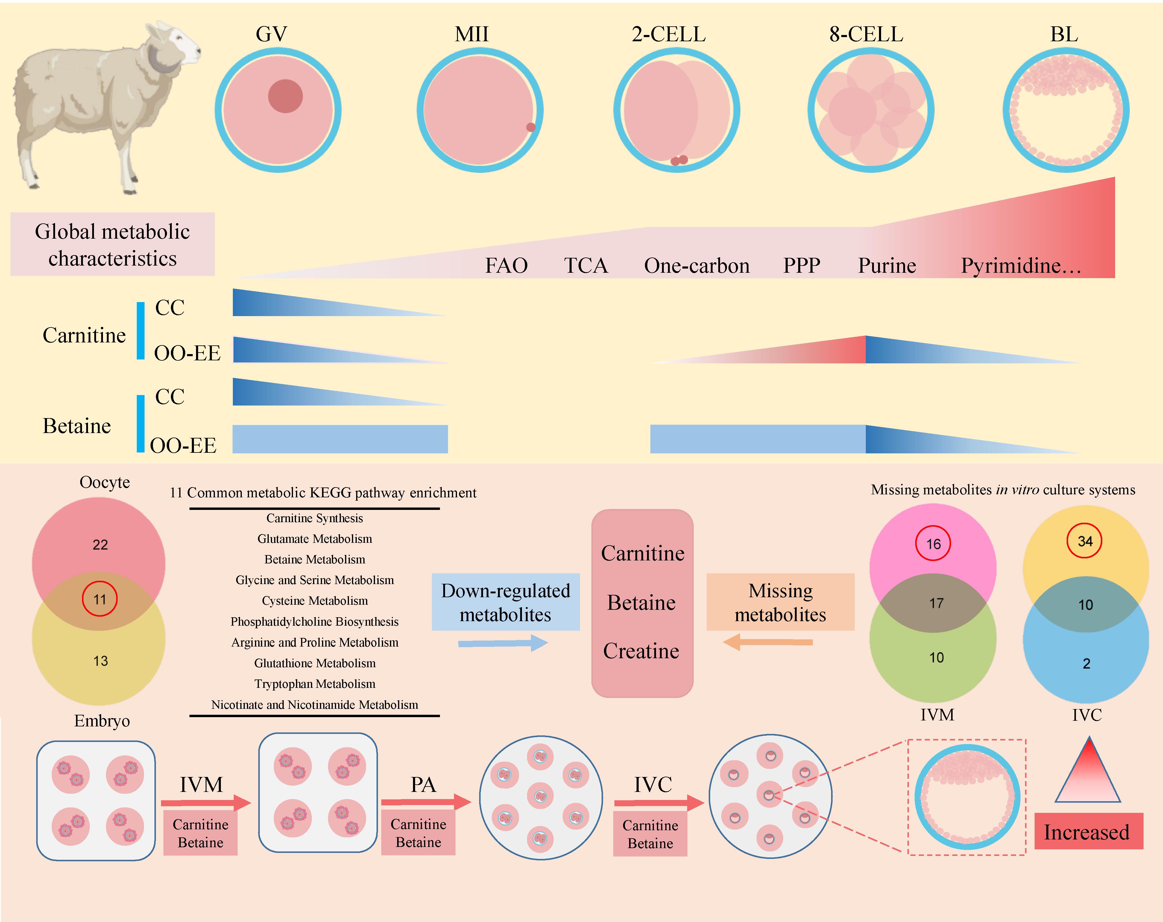 中國科學(xué)院西北高原生物研究所動物生態(tài)與資源保護(hù)研究團(tuán)隊與四川農(nóng)業(yè)大學(xué)動物科技學(xué)院團(tuán)隊合作,通過利用超靈敏微量代謝組學(xué)技術(shù)和單細(xì)胞轉(zhuǎn)錄組學(xué)技術(shù),對綿羊卵母細(xì)胞體外成熟及早期胚胎體外發(fā)育的代謝特征進(jìn)行了解析,發(fā)現(xiàn):從GV期卵母細(xì)胞至2-細(xì)胞胚胎階段整體代謝水平呈上升趨勢,為促進(jìn)卵母細(xì)胞成熟和合子發(fā)育提供了必要的代謝底物;而在2-細(xì)胞胚胎至8細(xì)胞胚胎階段,整體代謝表現(xiàn)出安靜狀態(tài),有助于減少氧化應(yīng)激對細(xì)胞的損傷;在8-細(xì)胞胚胎至囊胚階段,整體代謝水平又明顯增加,為早期囊胚的形成、增殖分化以及表觀修飾過程提供能量和所需的代謝底物。同時,鑒定出肉毒堿、甜菜堿和肌酸為該體外培養(yǎng)系統(tǒng)所缺失的關(guān)鍵代謝物。進(jìn)一步研究發(fā)現(xiàn),肉毒堿可促進(jìn)綿羊卵母細(xì)胞脂肪酸氧化,并降低脂質(zhì)含量和脂質(zhì)過氧化水平,同時還可以調(diào)節(jié)紡錘體形態(tài)。而甜菜堿則具有調(diào)節(jié)綿羊早期胚胎發(fā)育過程中滲透壓應(yīng)激和甲基化修飾的作用。當(dāng)聯(lián)合肉毒堿與甜菜堿添加至體外培養(yǎng)體系時,顯著提高了綿羊卵母細(xì)胞的囊胚發(fā)育率。該研究結(jié)果為提高卵母細(xì)胞成熟和胚胎培養(yǎng)提供了新的視角。