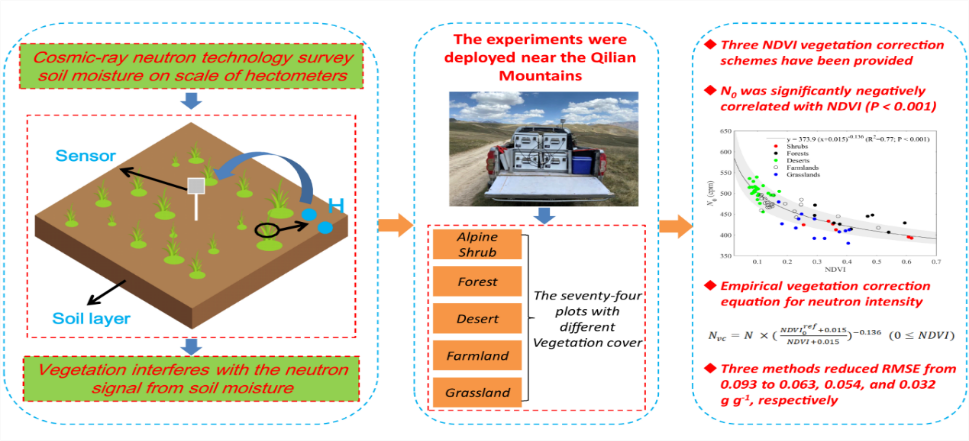 中國科學(xué)院西北生態(tài)環(huán)境資源研究院趙文智和張勇勇研究團(tuán)隊(duì)通過野外考察、定位觀測(cè)和模型分析等手段,從樣地—樣線—區(qū)域多尺度,對(duì)祁連山、河西走廊近地表宇宙射線中子強(qiáng)度特征、非土壤水氫源類型和中尺度土壤水分時(shí)空格局等進(jìn)行了研究。