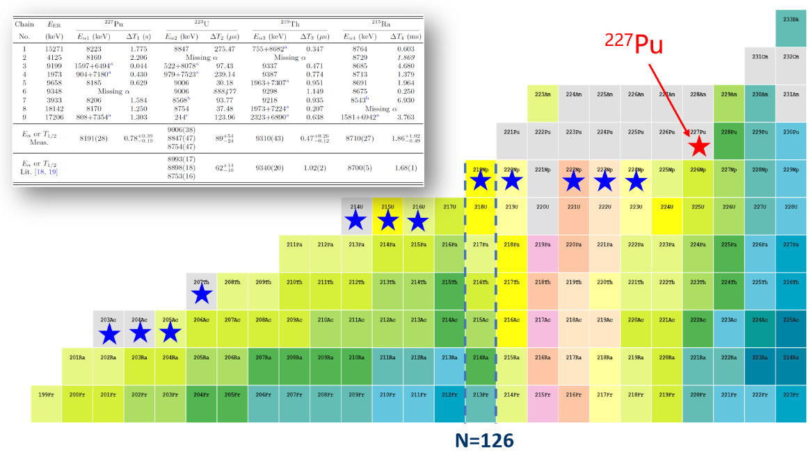 圖:實(shí)驗(yàn)觀測到的9個新核素钚-227的α衰變事件以及钚-227在核素圖上的位置(紅色五星)。藍(lán)色五星標(biāo)記的是近代物理所團(tuán)隊(duì)此前合成的部分新核素。(圖/楊華彬)