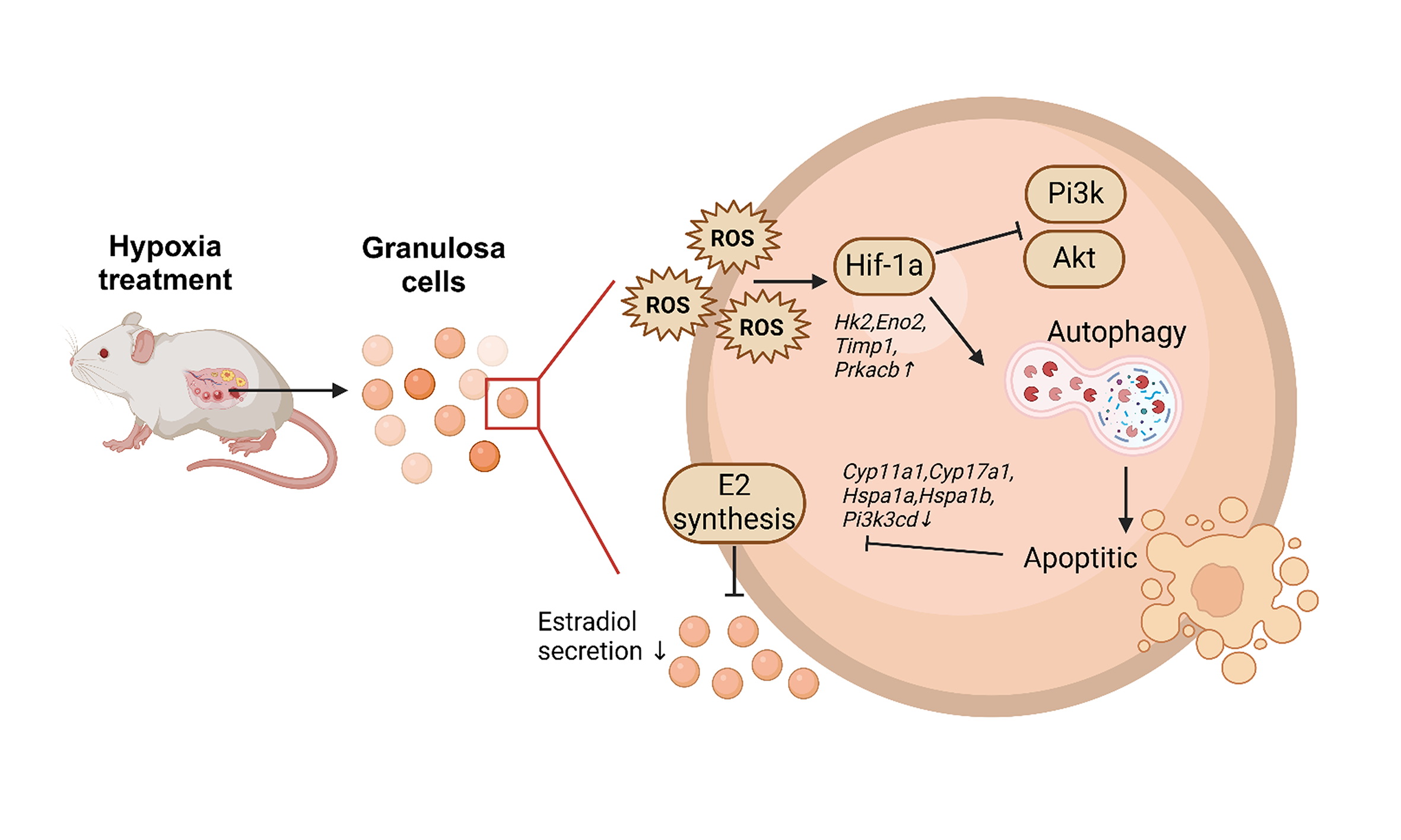 文章模式圖:胚胎期低氧誘導(dǎo)成年卵巢顆粒細胞的Hif1a激活和自噬