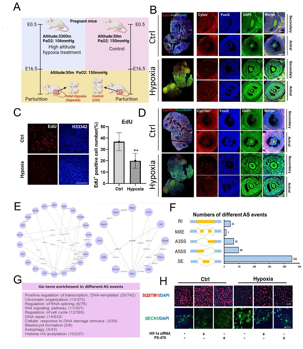 文章代表圖:A:胚胎期低氧模型建立示意圖;B:細胞色素C免疫熒光染色;C:體外細胞培養(yǎng)EdU細胞增殖活性檢測;D:雌激素合成轉(zhuǎn)化關(guān)鍵酶Cyp19a1免疫熒光染色;E:轉(zhuǎn)錄因子PPI富集分析圖;F:不同類型可變剪切差異統(tǒng)計;G:不同可變剪切事件發(fā)生基因的Go富集分析;H:體外實驗通過轉(zhuǎn)染Hif-1a SiRNA 和抑制劑添加檢測自噬相關(guān)蛋白表達水平