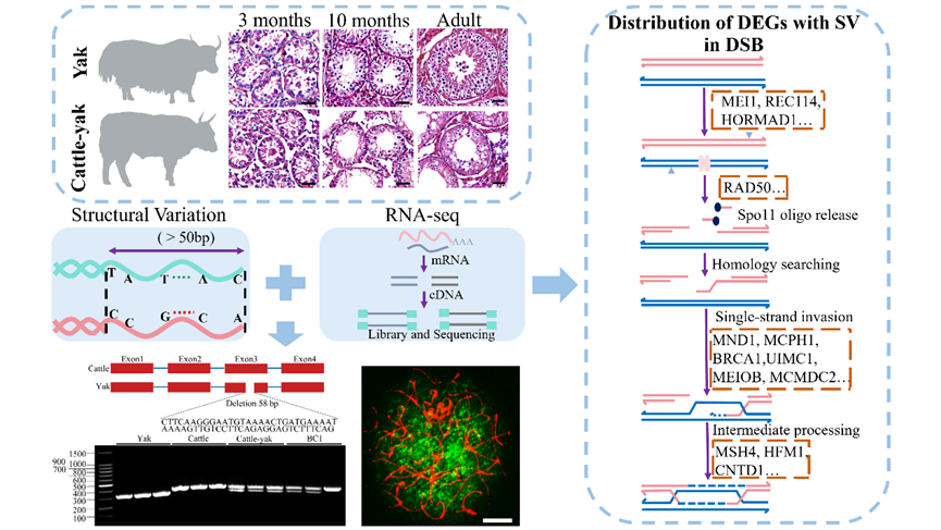 生殖隔離阻斷或減少了物種間的基因交流,對維持物種完整性至關(guān)重要。犏牛是牦牛(Bos grunniens)和普通牛(Bos taurus)的雜交后代,表現(xiàn)為雌性可育而雄性不育。作為研究家畜不完全生殖隔離的良好模型,犏牛受到了繁殖生物學(xué)領(lǐng)域的廣泛關(guān)注,但導(dǎo)致其精子發(fā)生阻斷的關(guān)鍵機制依然不明確。Dobzhansky-Muller 模型認為,雜交致死或不育是由不同基因位點的不相容所造成的?;蚪M結(jié)構(gòu)變異(Genomic structural variation, SV)是遺傳多樣性最重要的來源之一,包括缺失、重復(fù)、插入、易位和倒位等。SV可通過改變基因表達或抑制減數(shù)分裂重組,直接導(dǎo)致雜交動物生殖細胞發(fā)育阻斷。目前,親本間SV對犏牛雄性不育的影響在很大程度上仍不明確,遺傳不相容與犏牛生精細胞基因表達失調(diào)之間的關(guān)系也尚未得到全面解析。
