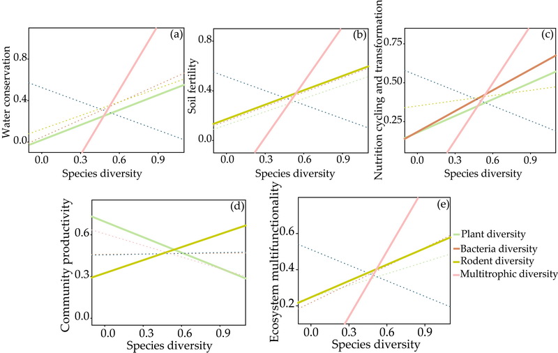 不同營養(yǎng)級物種多樣性對生態(tài)系統(tǒng)功能的影響:(a) 水分保持;(b) 土壤肥力;(c) 養(yǎng)分循環(huán)與轉(zhuǎn)化;(d) 群落生產(chǎn)力;(e) 生態(tài)系統(tǒng)多功能性。實線表示顯著關(guān)系,虛線表示無顯著關(guān)系