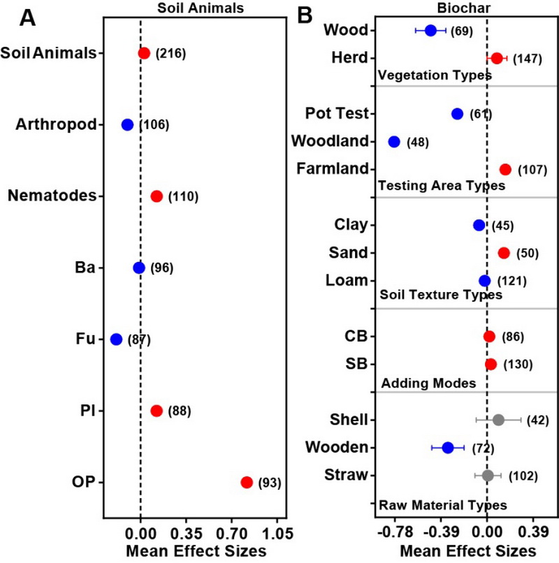 近年來,全球范圍內(nèi)對生物炭作為土壤調(diào)節(jié)劑的應(yīng)用興趣顯著增加。土壤動物在土壤生態(tài)系統(tǒng)中種類繁多,并對土壤環(huán)境的變化表現(xiàn)出高度敏感性。它們在評估不同田間管理條件和土地利用狀況下的土壤健康方面發(fā)揮著至關(guān)重要的作用。生物炭對土壤動物的影響既包括土壤動物的直接取食作用,也涉及生物炭對土壤環(huán)境的間接影響。然而,目前尚缺乏關(guān)于生物炭添加對土壤動物影響的系統(tǒng)性和定量性研究。薈萃分析能夠促進對已有研究結(jié)果的定量整合,通過整合多個發(fā)現(xiàn),尤其是在特定主題下樣本量相對較小的情況下,可以提高統(tǒng)計效率,解決研究結(jié)果間的不一致性,探討現(xiàn)有文獻中的發(fā)表偏差,制定新的研究問題,并為進一步分析研究提供理論性框架和標準化體系。