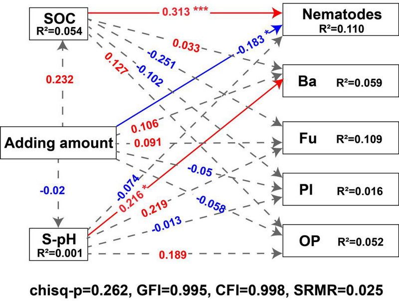中國科學(xué)院西北高原生物研究所高寒濕地生態(tài)系統(tǒng)近自然修復(fù)與功能提升研究團隊開展了一項薈萃分析,旨在研究生物炭添加對不同處理和實驗條件下土壤動物的影響。結(jié)果表明:(1)生物炭的添加顯著增加了土壤動物的豐度(0.027),并改變了其群落結(jié)構(gòu);(2)生物炭促進了土壤線蟲的豐度(0.124),而抑制了土壤節(jié)肢動物的豐度(?0.101);(3)生物炭通過直接和間接途徑影響土壤動物的豐度,其中最顯著的途徑是由土壤有機碳(SOC)和土壤pH值介導(dǎo)的。生物炭添加的數(shù)量和持續(xù)時間對不同線蟲物種的豐度產(chǎn)生了不同的影響,最終導(dǎo)致土壤微型食物網(wǎng)結(jié)構(gòu)的改變。
