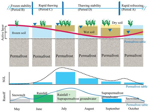 圖1. 多年凍土活動(dòng)層凍融過程“土壤水-凍土層上水-地表徑流”動(dòng)態(tài)的響應(yīng)理論框架