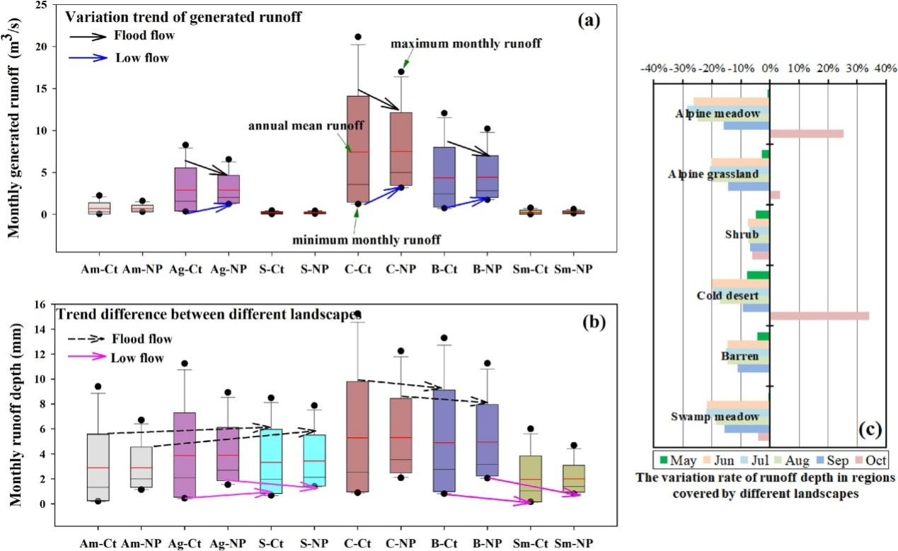 圖2.凍土退化對典型流域不同下墊面的徑流過程及水源涵養(yǎng)能力影響。橫坐標(biāo)Am,Ag,S,B,C,和?Sm 分別表示高寒草甸、高寒草原、灌叢、裸地、寒漠和沼澤草甸.?Ct?和?NP?分別表示現(xiàn)狀和凍土退化情景