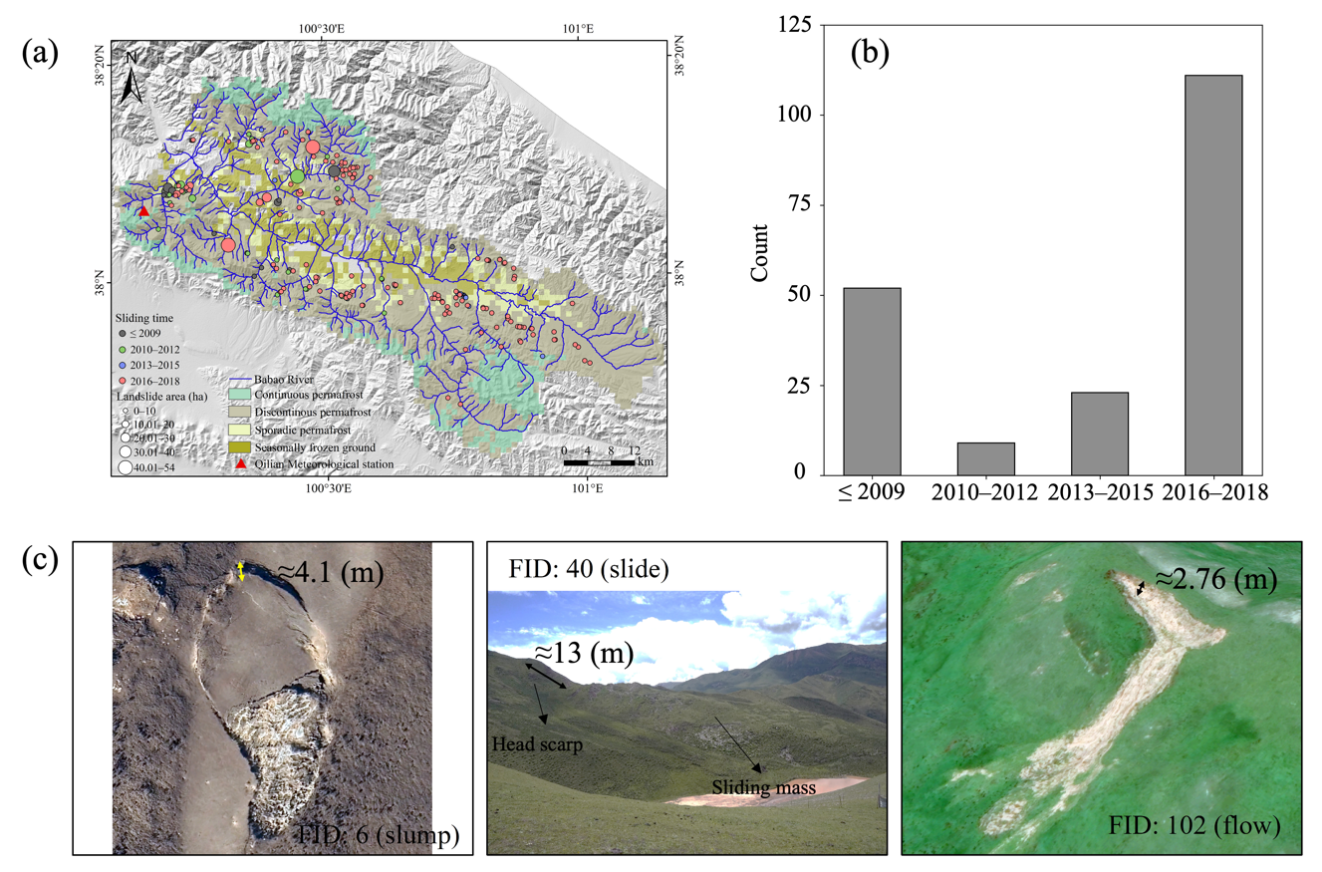 該成果以Elevation-dependent shift of landslide activity in mountain permafrost regions of the Qilian Mountains為題發(fā)表在Advances in Climate Change Research期刊,并獲國家重點(diǎn)研發(fā)計(jì)劃項(xiàng)目、國家自然科學(xué)基金項(xiàng)目和中國科學(xué)院“西部之光”基金項(xiàng)目等項(xiàng)目的資助。