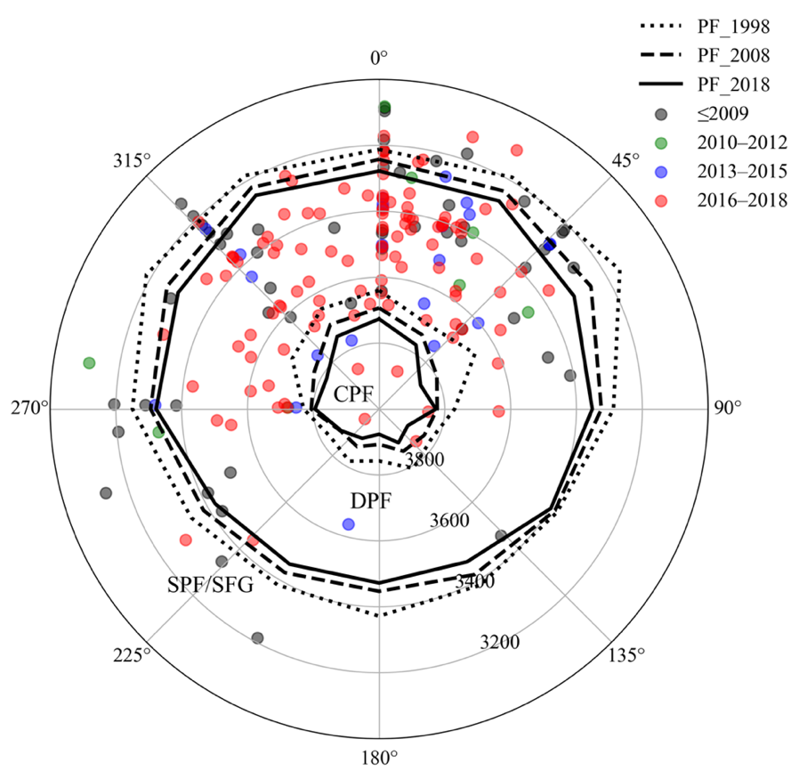 圖3:多年凍土邊界與滑坡的海拔、坡向和分布關(guān)系。三種不同線型分別代表1998年、2008年和2018年間稀疏多年凍土(SPF)、不連續(xù)多年凍土(DPF)和連續(xù)多年凍土(CPF)邊界的平均海拔。內(nèi)圈的三條線為SPF到DPF的過渡區(qū),外圈的三條線為DPF到CPF的過渡區(qū)。不同顏色的小圓點(diǎn)表示滑坡在各時間段的海拔、坡向和數(shù)量分布特征