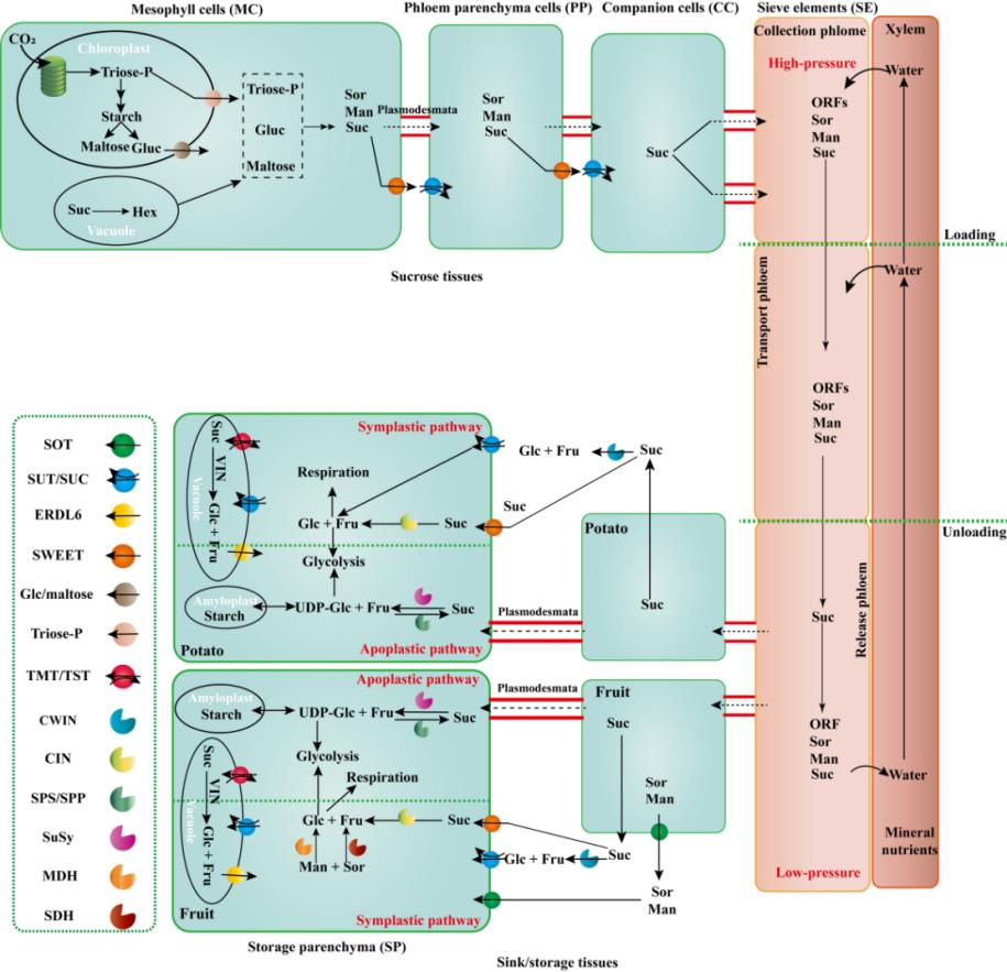 圖2.?糖轉(zhuǎn)運蛋白從源細胞到庫細胞的長距離糖運輸模型
