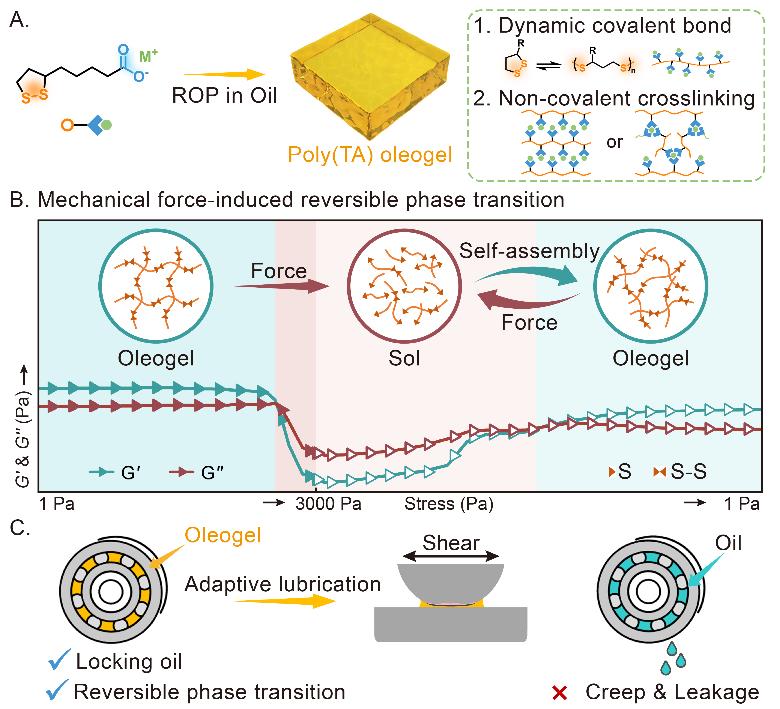 針對(duì)傳統(tǒng)潤(rùn)滑油脂在新型高端裝備應(yīng)用中面臨爬移、泄漏、粘滯阻力高等難以應(yīng)對(duì)復(fù)雜多變工況的問(wèn)題。近日,中國(guó)科學(xué)院蘭州化學(xué)物理研究所潤(rùn)滑材料全國(guó)重點(diǎn)實(shí)驗(yàn)室材料表面與界面研究組通過(guò)構(gòu)筑具有機(jī)械力響應(yīng)特性的動(dòng)態(tài)共價(jià)網(wǎng)絡(luò),開(kāi)發(fā)了一類具有力誘導(dǎo)可逆相轉(zhuǎn)變能力的自適應(yīng)油凝膠潤(rùn)滑材料(PTA油凝膠)。PTA油凝膠可適應(yīng)設(shè)備啟停,在溶膠或凝膠狀態(tài)保持和迅速轉(zhuǎn)換,且具有出色的潤(rùn)滑穩(wěn)定性、適應(yīng)不斷變化的運(yùn)動(dòng)工況。