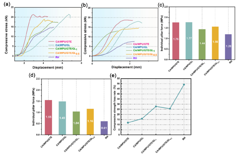 新型防凍固沙劑固結(jié)層在 27℃時的壓應(yīng)力(a)和抗壓強度(c);-20℃凍融循環(huán)試驗后的壓應(yīng)力(b)、抗壓強度(d)、抗壓強度損失率(e)