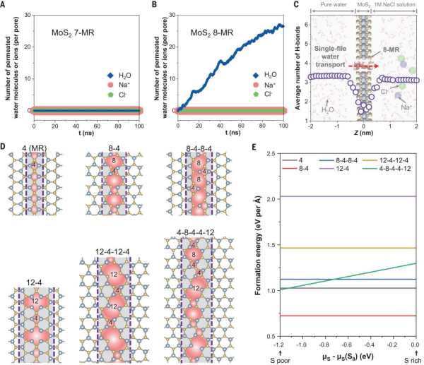 石國升研究員團隊基于前期水合離子界面相互作用的新理解,原創(chuàng)性提出離子可以精準調控二維通道尺寸,“裝訂”石墨烯膜用于離子篩分和海水淡化,此外還首次揭示自然條件下反?;瘜W計量比晶體Na2Cl/Na3Cl/K2Cl/Li2Cl/CaCl等反晶[Sci. Rep. 3,3436(2013);?Angew. Chem. Int. Ed. 10,10190 (2014);Phys. Rev. Lett. 134,12104 (2015);Phys. Rev. Lett. 117,238102 (2016);Nature 550,380 (2017);Nat. Chem. 10,694 (2018);Natl. Sci. Rev. 8,nwaa274 (2021);J. Colloid Interface Sci. 648,102 (2023);Nano Lett. 23,10884 (2023);Nat. Water 1,800 (2023);Small 60,21,2408566 (2025);J. Hazard. Mater. 487,137078 (2025);J. Am.Chem. Soc. 147,3478 (2025);Nano Lett. 25,2334 (2025)]。基于這些前期工作對界面水合離子相互作用的理解以及對受限空間離子篩分和輸運行為的認識,進一步發(fā)現(xiàn)通過調控MoS2晶界納米孔缺陷尺寸,可以實現(xiàn)有效水/離子分離和離子精準篩分,達到海水淡化及離子精準提取的效果。