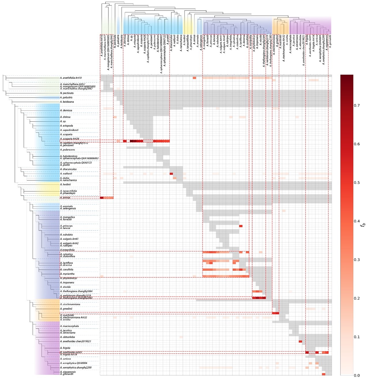 中國科學(xué)院西北高原生物研究所青藏高原植物適應(yīng)與進(jìn)化研究團(tuán)隊(duì)選擇東亞蒿屬及其近緣類群共94個(gè)物種進(jìn)行Illumina二代測序,利用質(zhì)體基因組、SNP數(shù)據(jù)和nrDNA重建了該類群的系統(tǒng)發(fā)育關(guān)系,并推測其生物歷史地理。研究結(jié)果表明,質(zhì)體捕獲、雜交、漸滲等事件導(dǎo)致了蒿屬及其屬下亞屬的強(qiáng)烈核質(zhì)沖突,現(xiàn)有的蒿屬下分類方法無法將大多數(shù)亞屬劃分為單系。東亞蒿屬為漸新世早期就地起源,氣候震蕩和高原隆升促進(jìn)了該類群的多樣化發(fā)展。黑蒿(A. palustris)、櫛葉蒿(A. pectinata)、庵閭(A. keiskeana)和臭蒿(A. hedinii)可能是東亞區(qū)域現(xiàn)代蒿屬下主要譜系的早期分化類群。本研究揭示了東亞蒿屬及其亞屬復(fù)雜的系統(tǒng)發(fā)育關(guān)系和進(jìn)化歷史,為蒿屬植物的演化提供了新的見解。