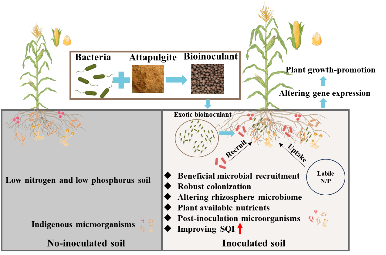 中國科學院西北生態(tài)環(huán)境資源研究院王若愚研究員團隊與奧地利國家技術(shù)研究院的Angela Sessitsch教授和Günter Brader教授合作,系統(tǒng)揭示了固體顆粒微生物菌劑(貝萊斯芽孢桿菌Bacillus velezensis FZB42與粘土材料組成)通過調(diào)控根際微生物群落和玉米基因應(yīng)答,改善貧瘠堿性黃土質(zhì)量并促進玉米生長的機制。研究設(shè)置了減施氮肥與不施磷肥的處理條件,探索了微生物菌劑在低外源肥料施用下,如何提高作物對土壤養(yǎng)分的吸收,進而促進增產(chǎn)的效果。