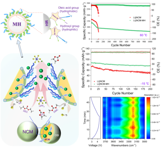 研究團隊首先以Tween80為框架物質(zhì)構(gòu)建一種弱交聯(lián)柔性受限空間,電沉積獲得所需超細納米氫氧化鎂載體(D50=15 nm),并通過Tween80原位改性實現(xiàn)納米氫氧化鎂功能化。用所得材料對鋰電池三元正極材料(LiNi0.5Co0.2Mn0.3O2)進行表面修飾,并進行電池組裝和性能測試。原位紅外分析表明,Li?與 Tween80 分子間存在持續(xù)的配位和解離過程,使Tween80 分子荷電狀態(tài)發(fā)生動態(tài)變化,并在電場作用下發(fā)生連續(xù)的構(gòu)型轉(zhuǎn)變,亦即“烷基鏈搖曳”行為。烷基鏈搖曳使得納米氫氧化鎂在電池循環(huán)伊始就參與反應(yīng),快速形成薄而致密的富鎂無機正極固態(tài)電解質(zhì)界面膜。這種膜熱穩(wěn)定性高、耐腐蝕性強,能夠有效抵御高溫電解液攻擊。而在低溫環(huán)境下,電解液通常會在正極表面積聚,并常因流動性差而阻礙鋰離子傳輸。此時烷基鏈搖曳可顯著促進電解液的界面流動,兼之富鎂界面層具有優(yōu)異離子導(dǎo)電性,使鋰離子低溫傳輸變得非常順暢。研究結(jié)果表明,通過“烷基鏈搖曳”界面驅(qū)動設(shè)計,鋰離子電池可在60℃穩(wěn)定充放電1000圈以上,同時保持70 mAh/g容量和90%以上庫侖效率。在-5℃和-15℃分別循環(huán)500圈、200圈后,容量仍能保持在80 mAh/g以上。該研究在配備熱管控系統(tǒng)后,電池實際寬溫域性能有望進一步提升。